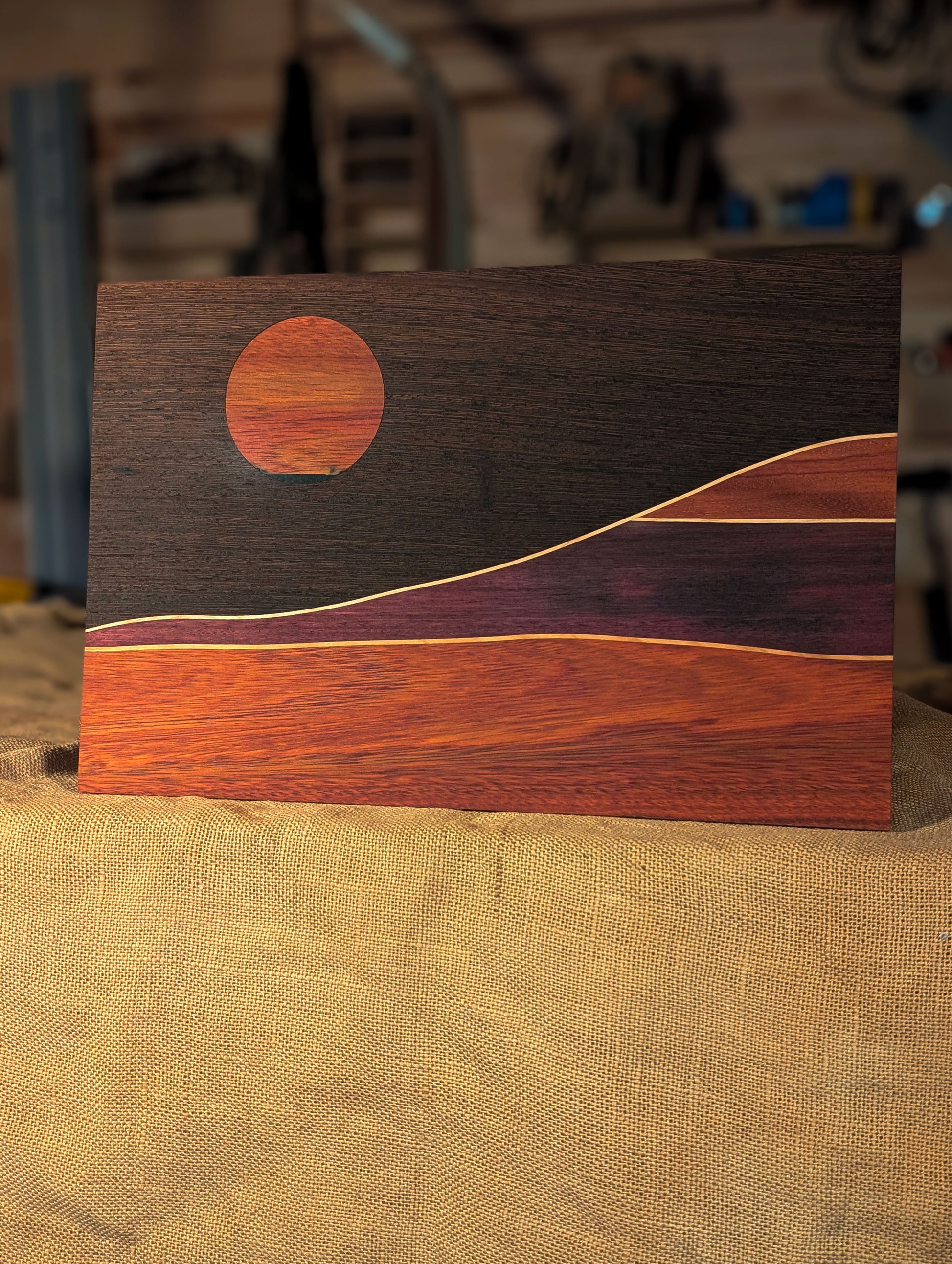 This particular board has a bit of an oopsie on it. The bloodwood moon inlay cracked at the bottom so I filled in the broken space with black epoxy. I suppose I could say it was intentional and part of the artistic process but I try not to be a piece of shit like that. SO just be aware of that if you buy this board. This board's horizon is made of Wenge and, as I said above, the moon is Bloodwood. The hill layers are Red Zebrawood, Purpleheart, and Bloodwood. Those layers are separated by Maple squiggles. The board measures 8.75 x 17 x .75