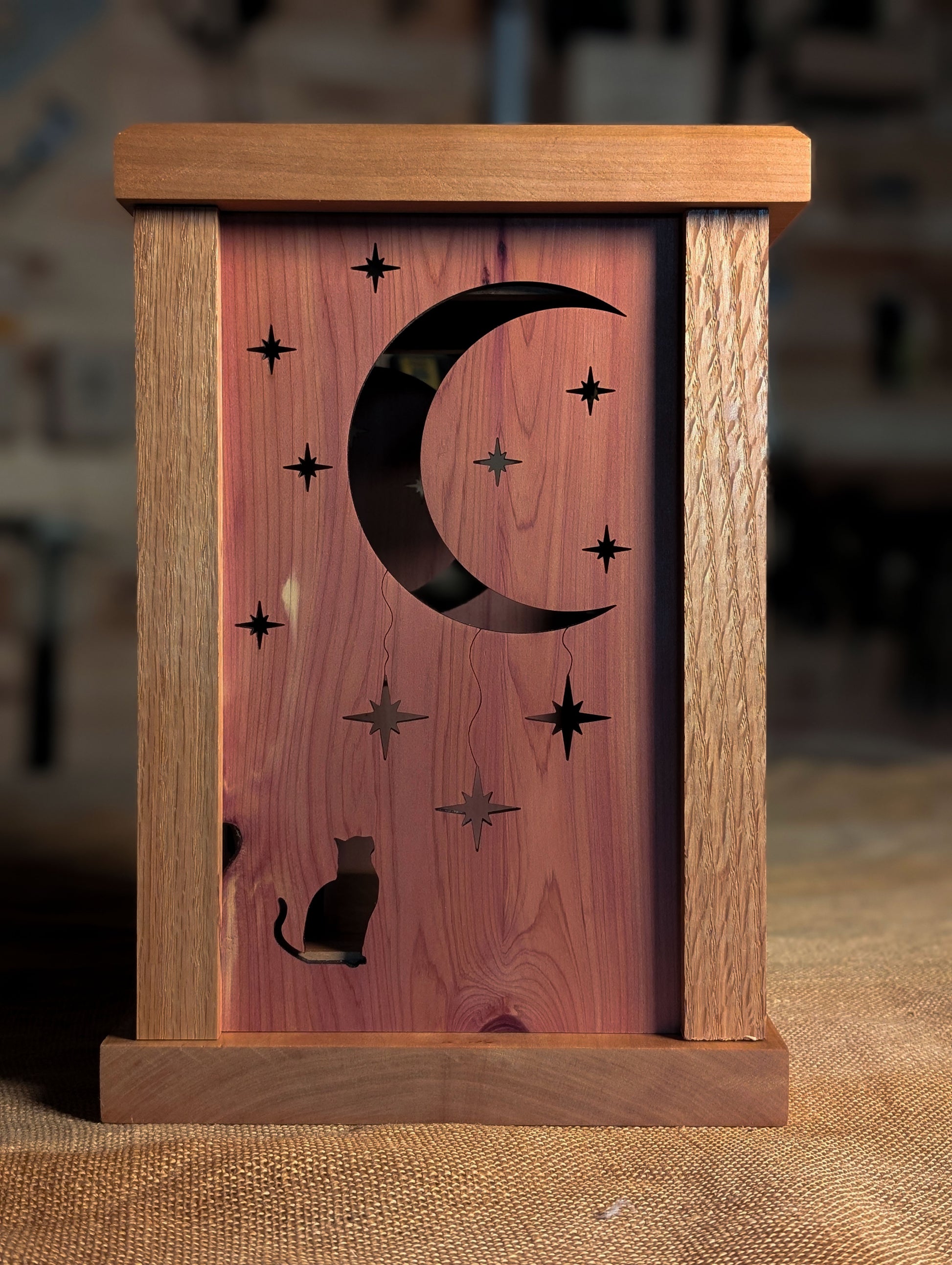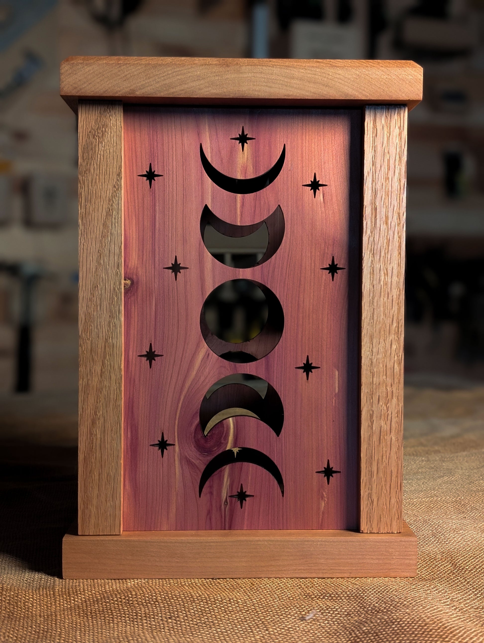 I made this luminary with Aromatic Cedar Panels. Each Luminary has a removable base and top. I'm including 3 flickering candle lights. They measure 12" tall by 8" wide