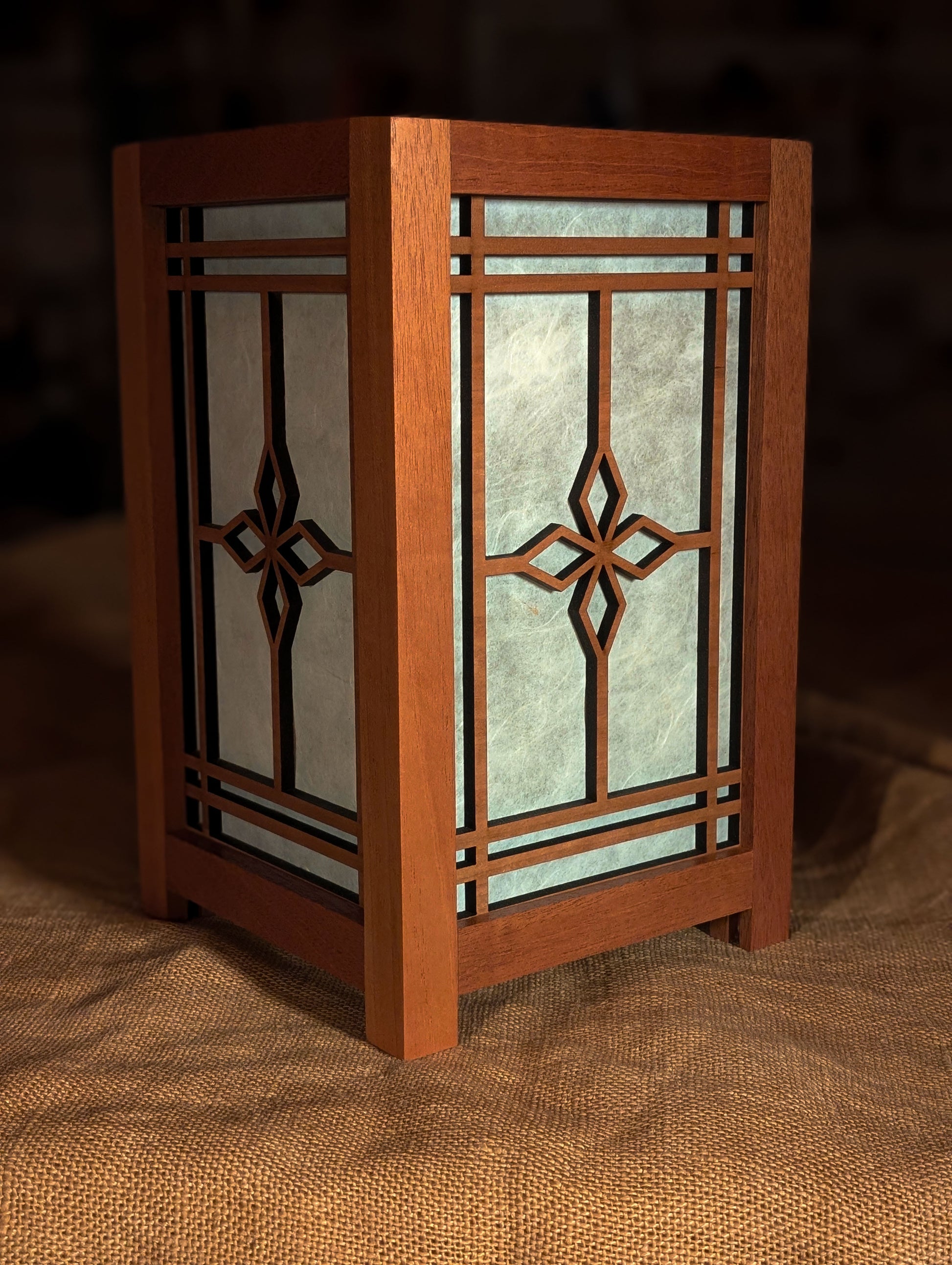 I made this lamp's frame from Sapele and the panels are 1/4" cherry ply that I lasered the designs into. The lamp is approximately 12" tall by 7.5" wide all around. There's a simple ceramic socket in the lamp. The lamp cord has an on/off switch. I finished it with multiple coats of shellac.