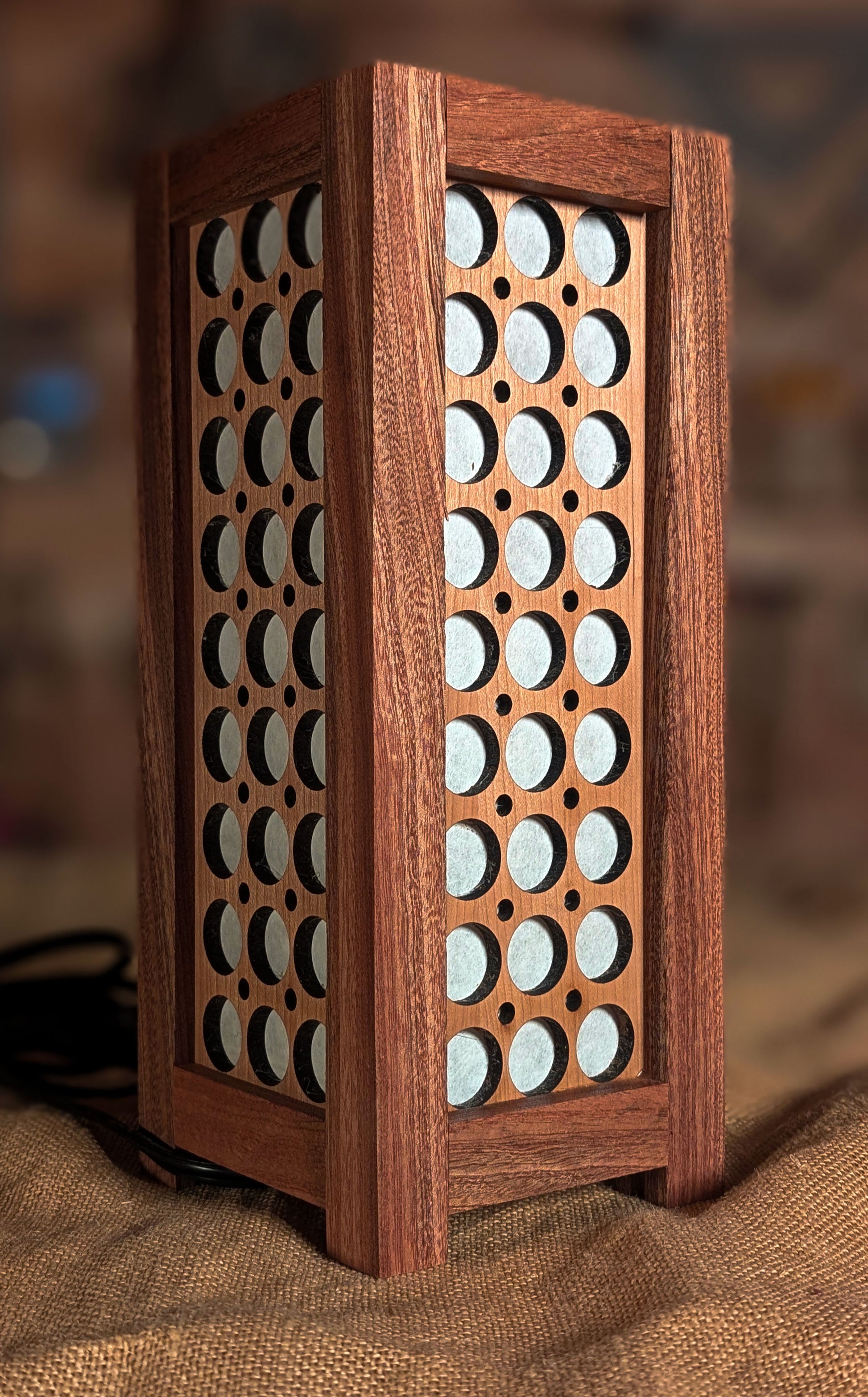 I made this lamp's frame from Sapele and the panels are 1/4" cherry ply that I lasered the designs into. The lamp is approximately 12" tall by 4" wide all around. There's a simple ceramic socket in the lamp. The lamp cord has an on/off switch. I finished it with multiple coats of shellac.