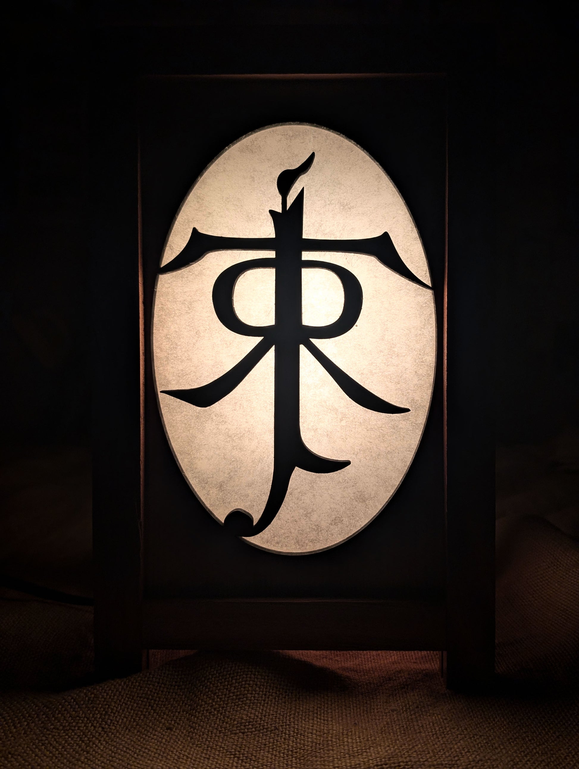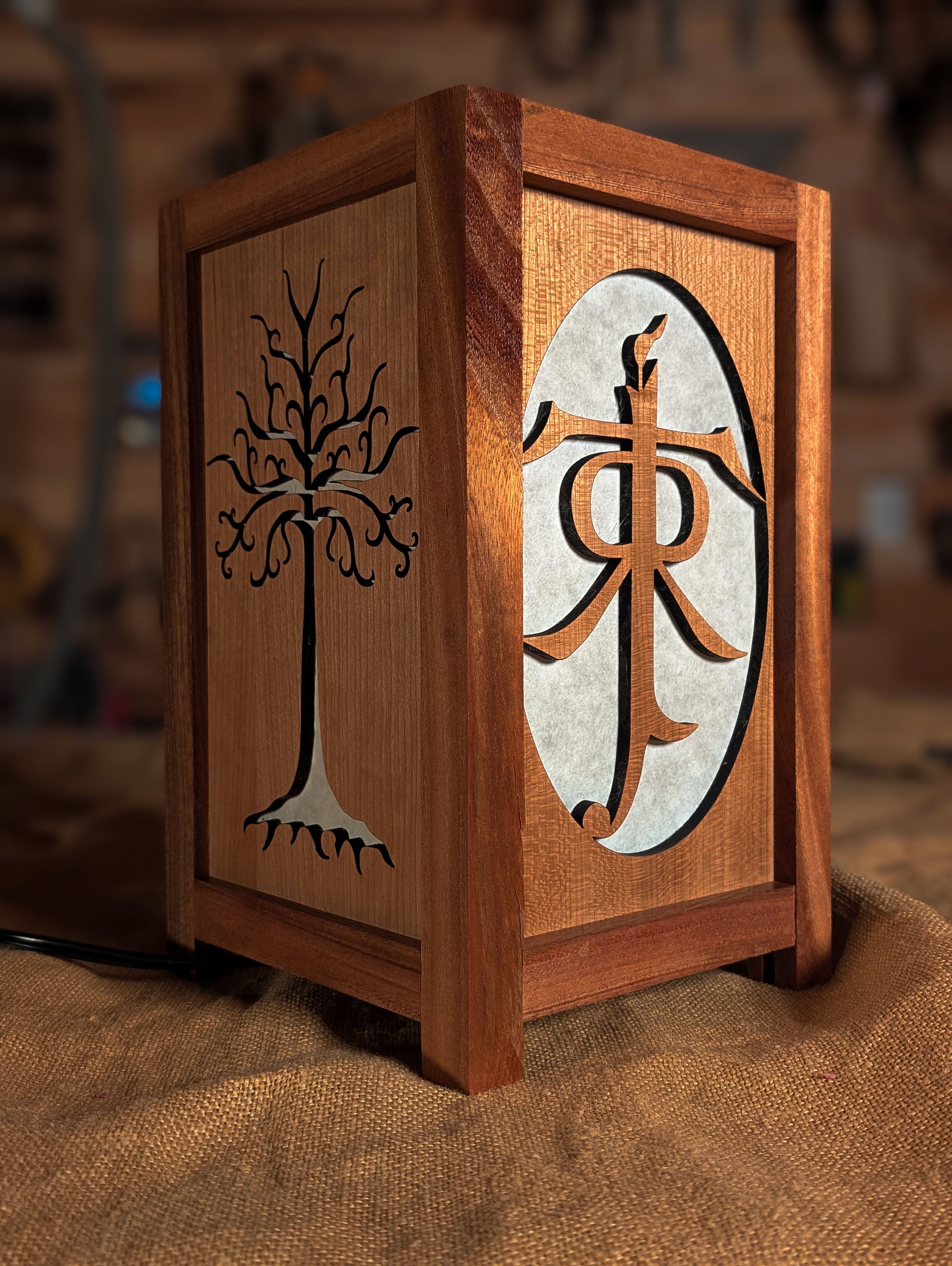 I made this lamp's frame from Sapele and the panels are 1/4" cherry ply that I lasered the designs into. The lamp is approximately 12" tall by 7.5" wide all around. There's a simple ceramic socket in the lamp. The lamp cord has an on/off switch. I finished it with multiple coats of shellac.